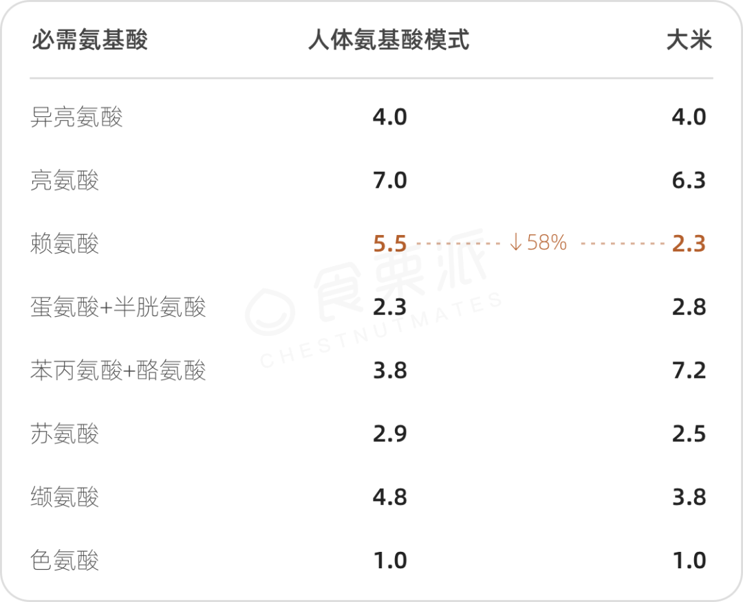 虽然大米也有人体必需的9种氨基酸(所以某些广告说:XXX含人体必需的9种氨基酸,真的不用在意,谁还没有啊)但赖氨酸含量比例偏低。