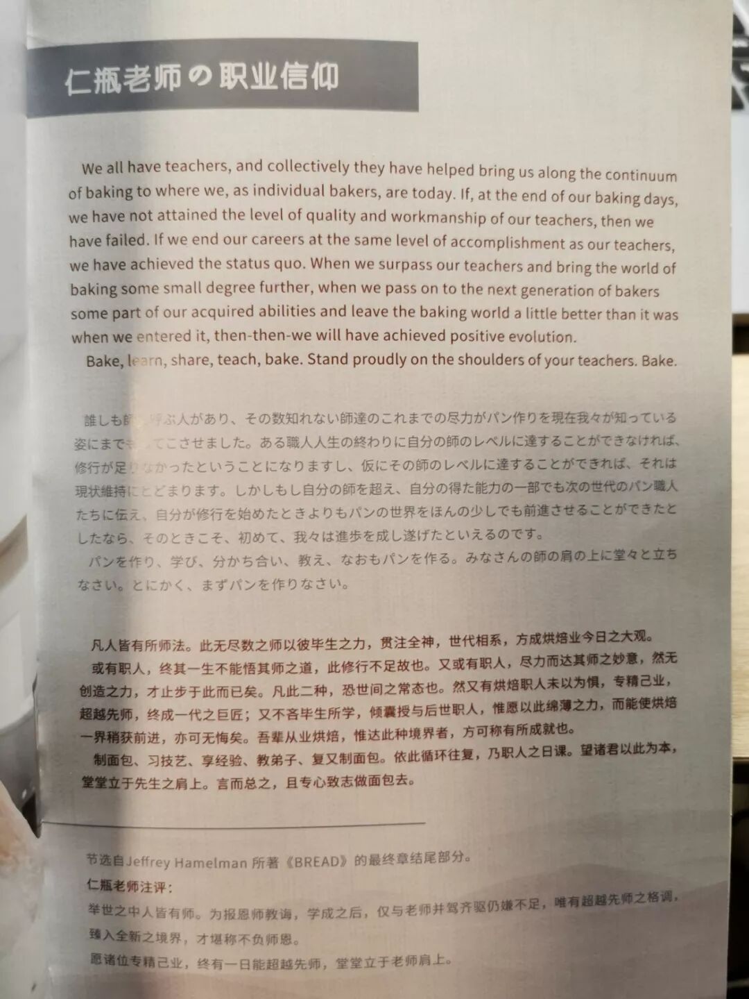 《bon painへの道》(迈向bon pain之道)这本书,是刚开始学习面包用日语的时候接触到的书,那时候还没有台湾版本,里面大量的外来语、专用语、人名、地名、材料名……字典有时也不能给出合适翻译,等终于把词汇都弄明白了,读懂仁瓶利夫老师到底在说什么,才意识到,要想了解面包文化,要想知道面包的本源,原来需要储备宽广的的知识量,日语、英语、法语、荷兰语;数学、生物、化学;历史、自然、地理、人文……在面包的世界里,自己永远显得渺小而无知。但这又是一个有趣的世界,每天都有很多内容等着你去探索。