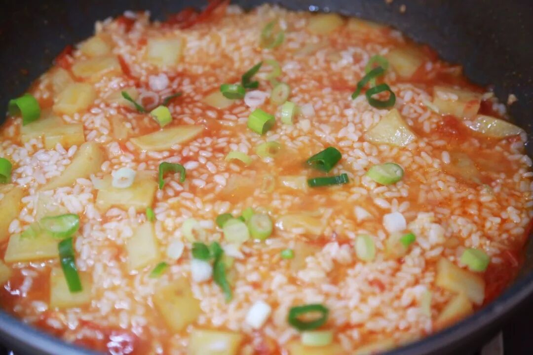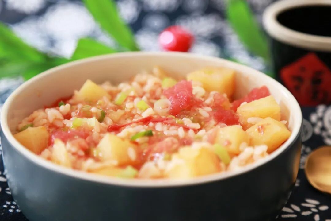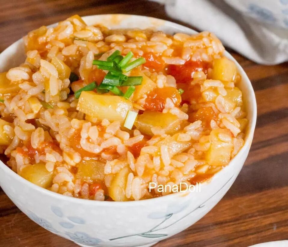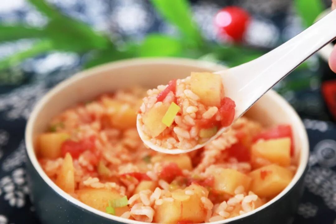 但是最近我新学了一招,用剩米饭做这道番茄土豆烩饭。口感湿润不噎,味道酸甜适中,连吃了几次非但没腻,反而时常回味,就赶紧拿来分享给你们。