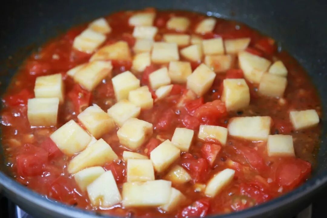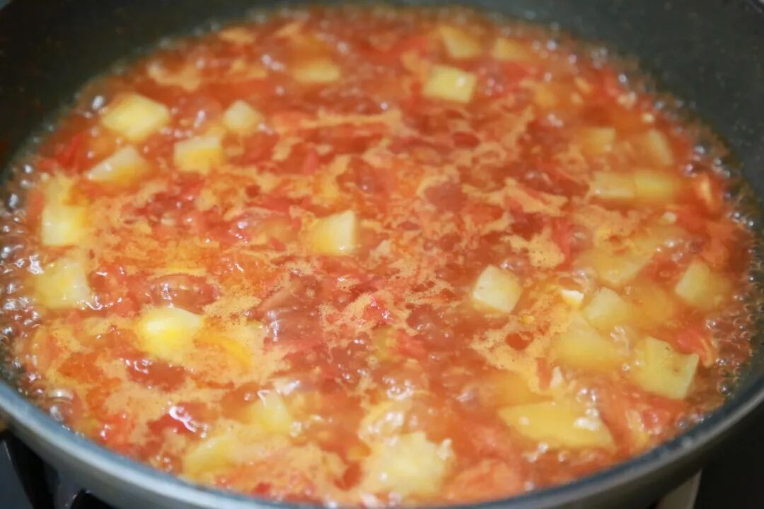 4 | 西红柿炒出汁后,放入土豆块,然后加入番茄酱、蚝油、生抽和适量盐,接着用铲子将其翻炒均匀。