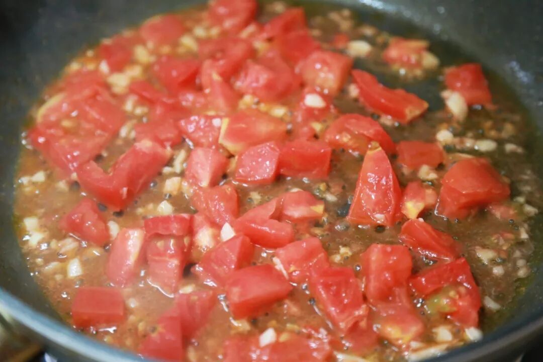 3 | 倒入西红柿丁,翻炒出汤汁即可。