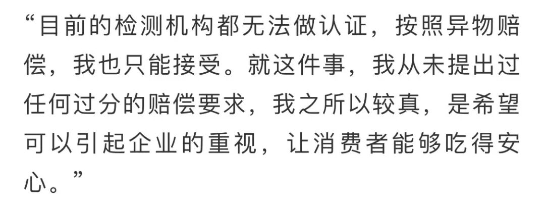 沟通协调后,7月31日,五芳斋方面又派人取走了留在孙女士处的另一半黑色异物,并于8月6日告知孙女士,目前已将产品送到第三方权威机构检验,请耐心等待结果。