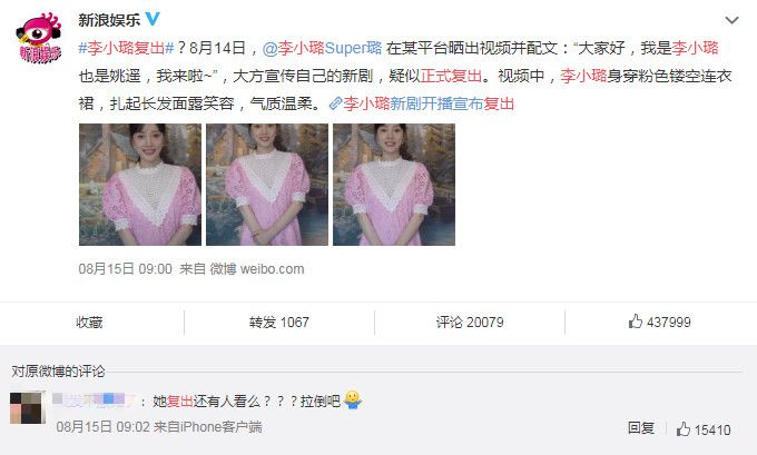 8月14日,#李小璐复出#上了热搜。在“夜宿门”事件两年后,李小璐的出现总算离开了PGONE、贾乃亮还有女儿,只和自己的新剧有关。