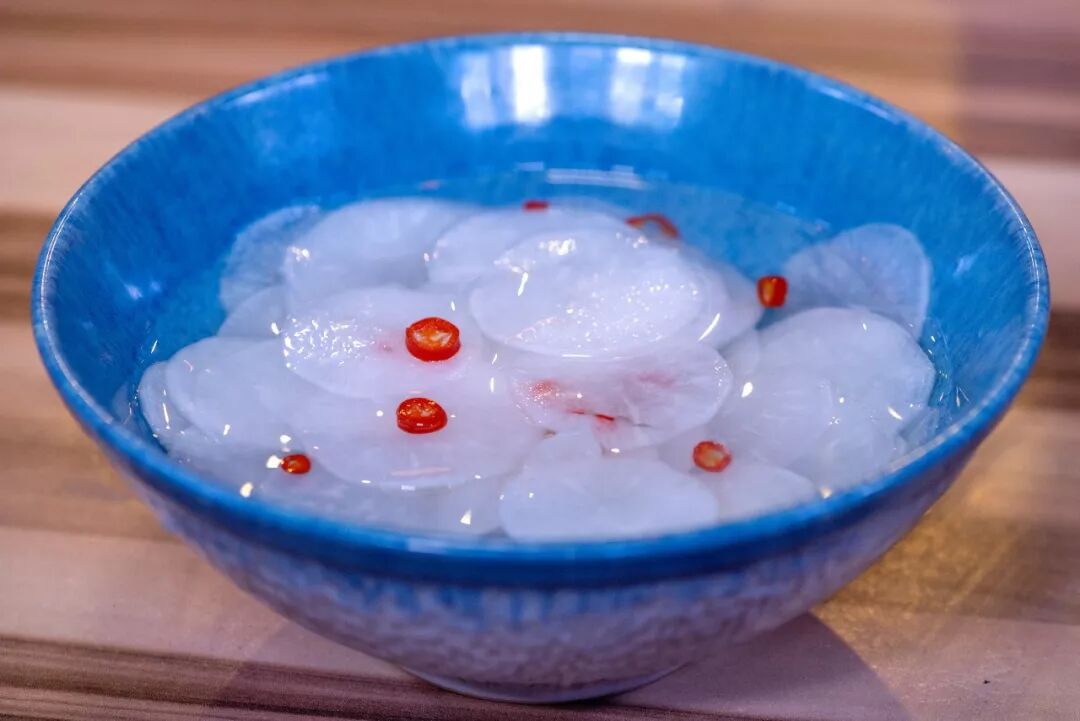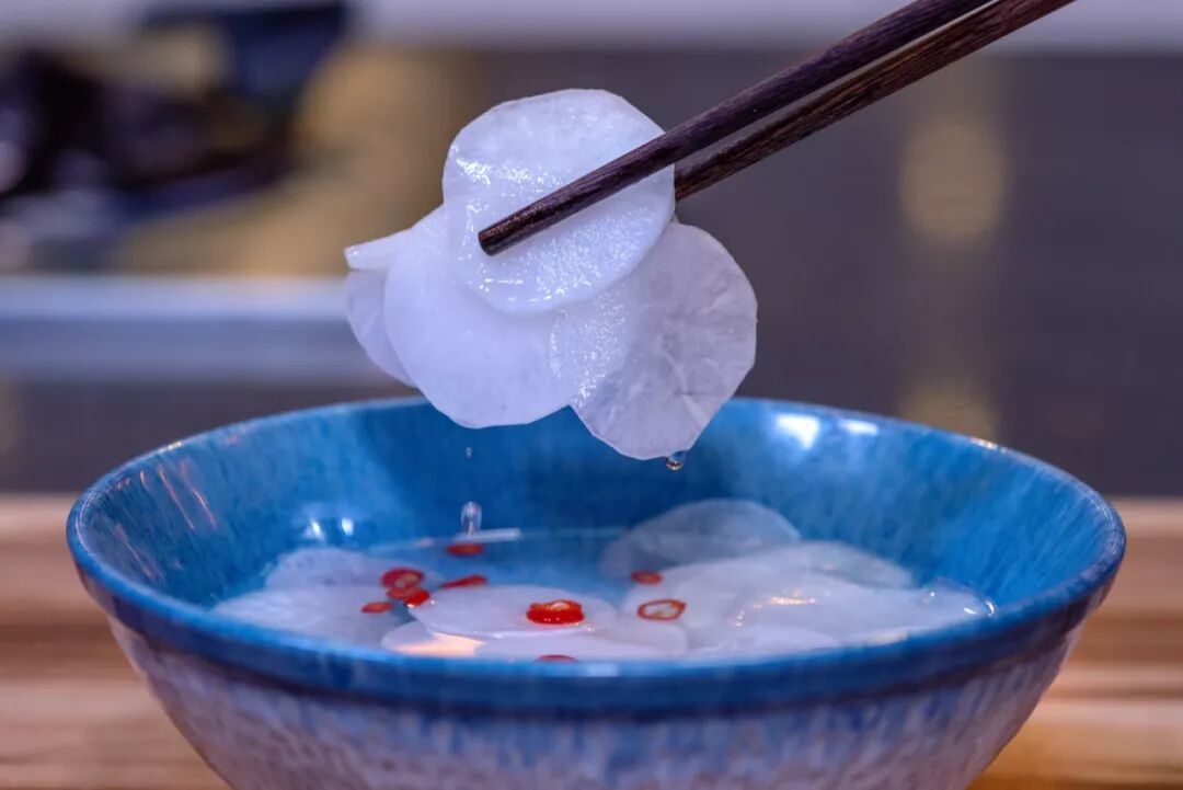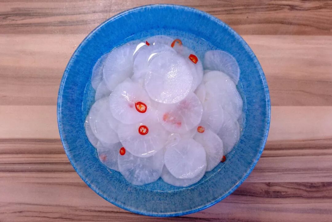 萝卜碗上放上一个装有水的碗压制萝卜,让萝卜腌制更快更入味。