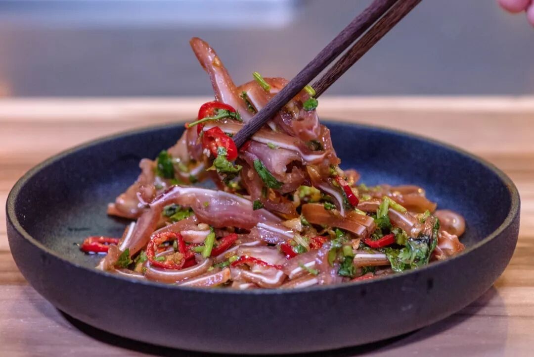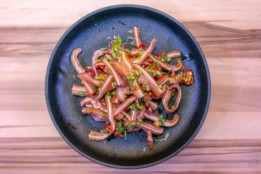 这道凉拌辣香猪耳朵入到嘴里一下子就醒了的感觉,因为它的麻香味能让人瞬间醒目,但它不是麻到不舒服,而是让人很享受,很开胃。凉拌猪耳朵可能我们常吃,但师父调的这个酱料,味道的层次更丰富,吃在嘴里立马清醒,喜欢的就试试看哟~