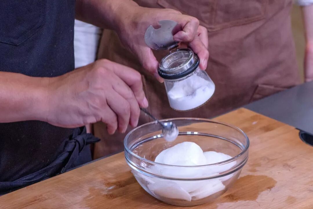 切好的萝卜片放入碗中,然后加入适量盐腌制。