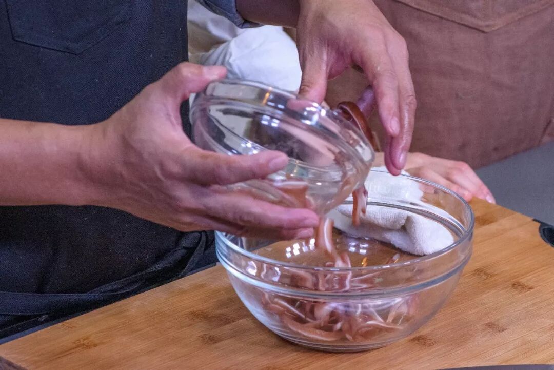 腌好的萝卜挤干水分,然后放入清水碗中洗净,洗好的萝卜片放入水中浸泡。