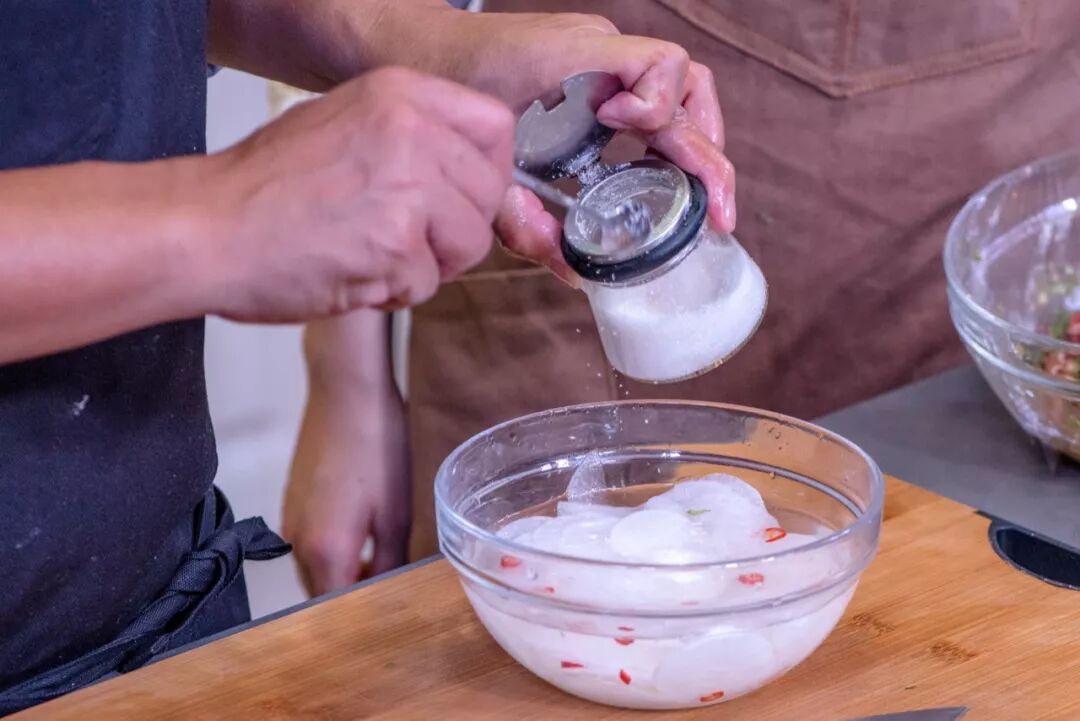 碗中放入适量糖、白醋调味,然后抓腌均匀。