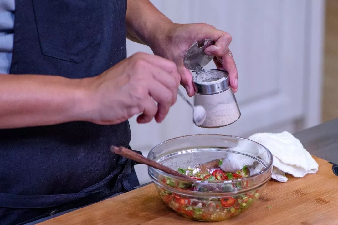 辣椒香菜碗中放入蒜末、适量盐、酱油、糖、芝麻油、花椒油、白胡椒和花椒粉调味。