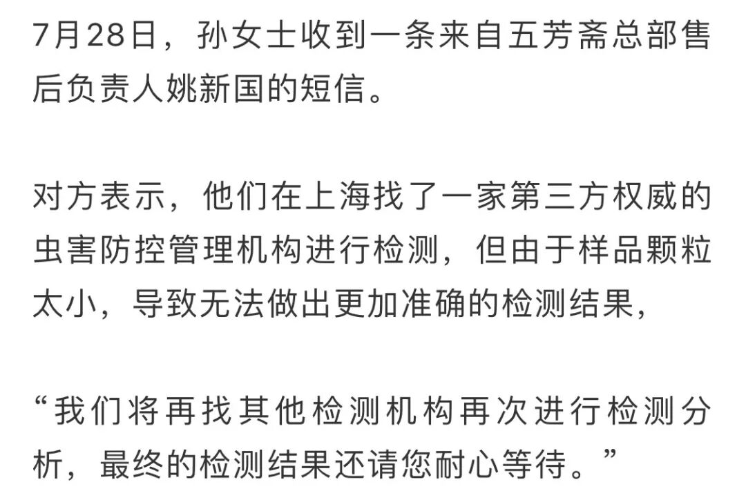 沟通协调后,7月31日,五芳斋方面又派人取走了留在孙女士处的另一半黑色异物,并于8月6日告知孙女士,目前已将产品送到第三方权威机构检验,请耐心等待结果。