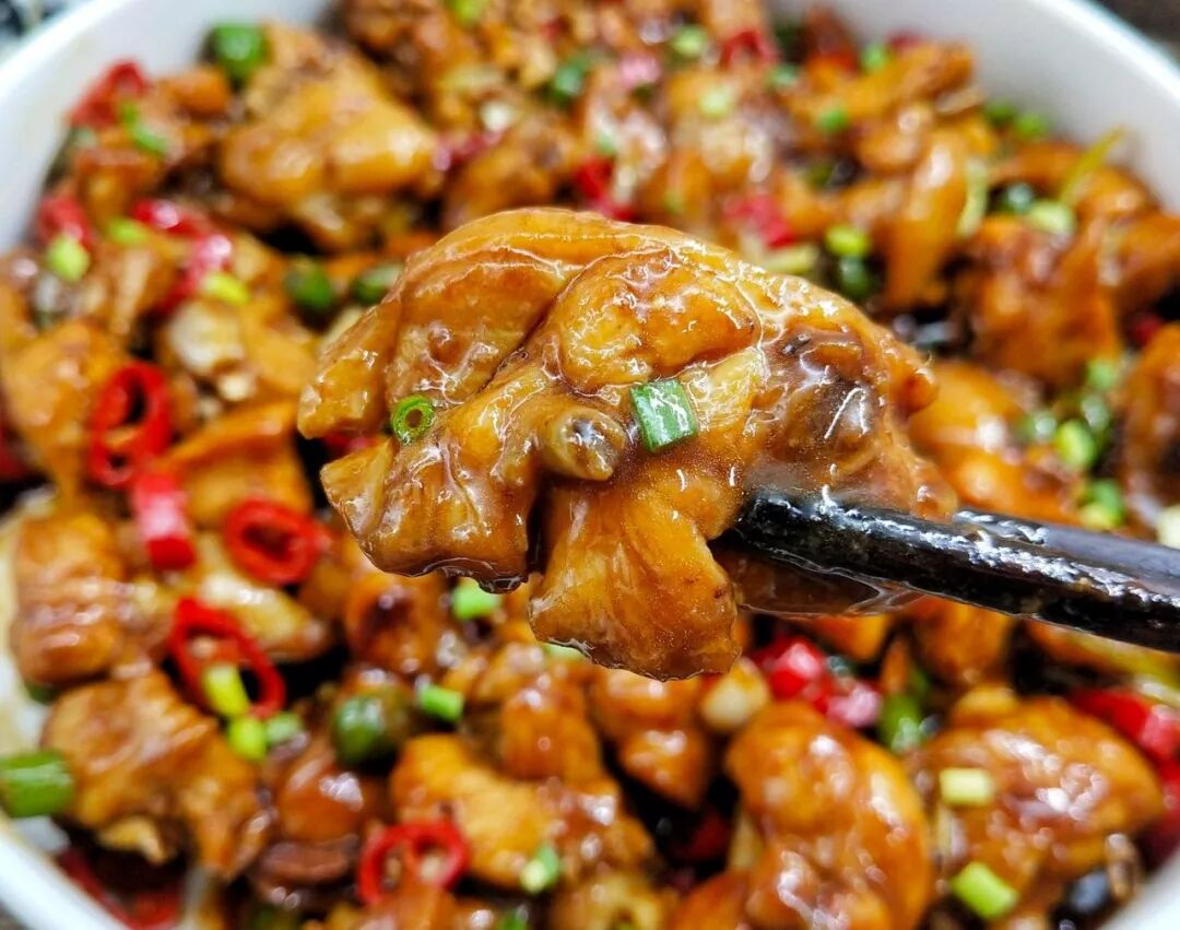 1. 鸡肉斩成小块,不要切的太小,炒的时候会回缩一些,加入两勺生抽,一勺料酒小半勺的白糖抓匀,腌制20分钟。
