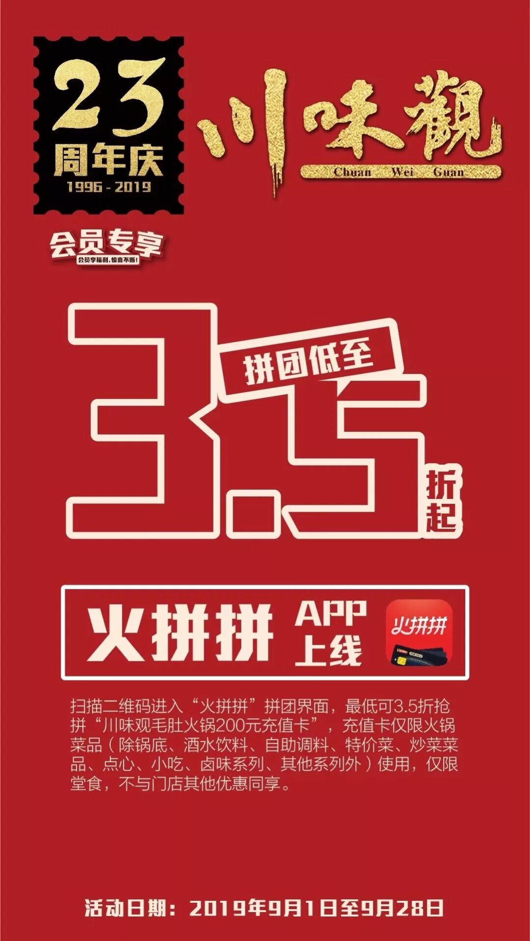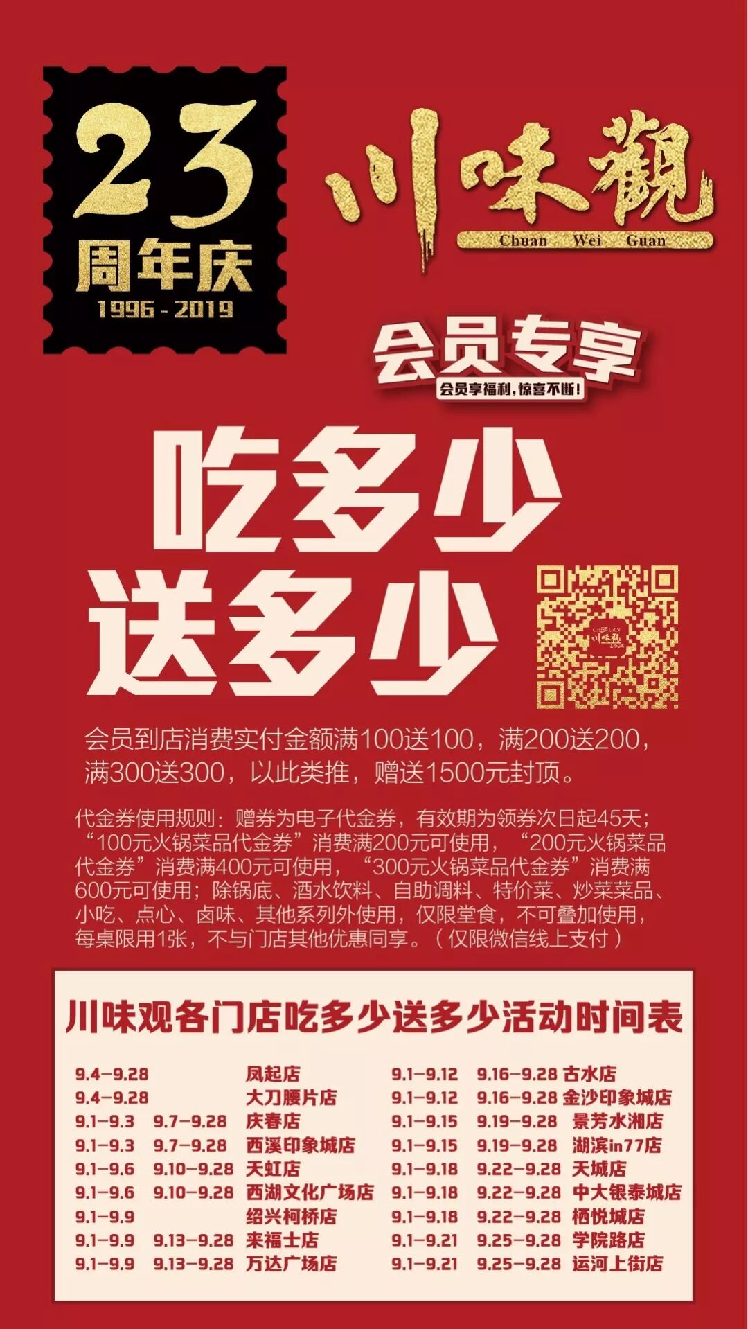 9.1-9.28,川味观会员到店消费实付满100送100,满200送200,满300送300...最高可送1500元!名副其实吃多少送多少~这波操作简直6到不行~