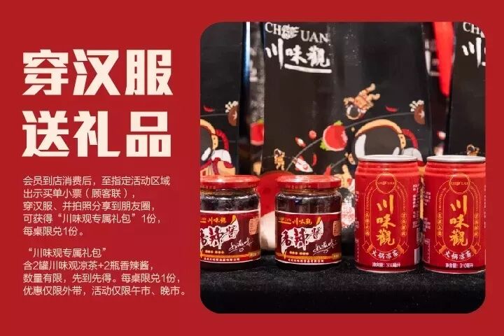 9.1-9.28,在5折优惠门店内吃饭,穿上汉服吃饭打卡,还能美滋滋得收到川味观免费送的小礼物!