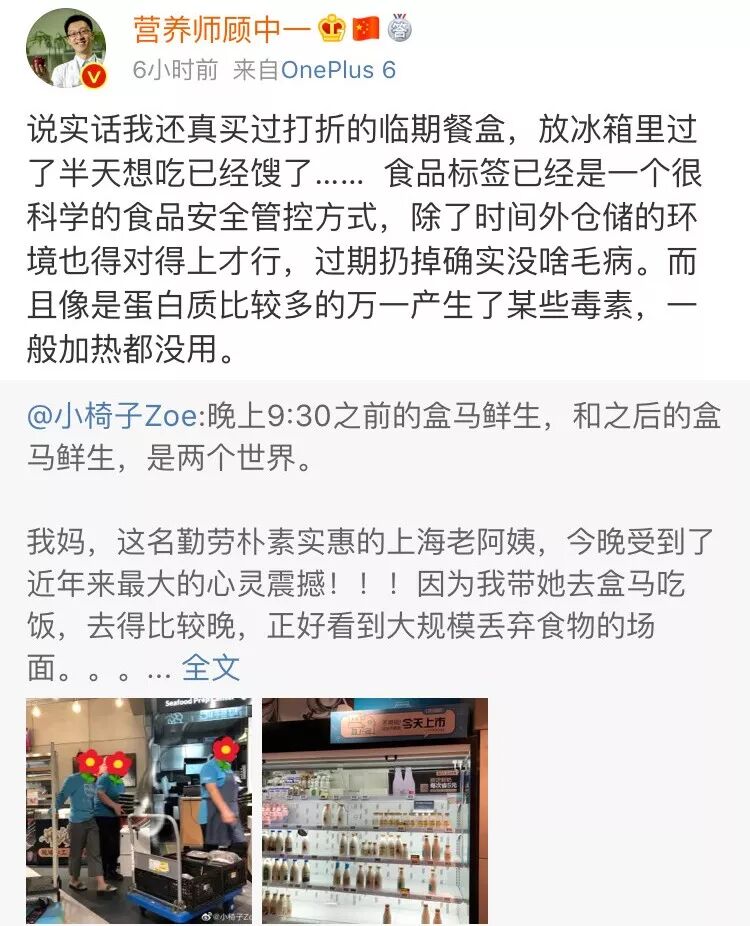 - 今天微博上,”盒马鲜生销毁过期食品“的事儿,引起很多人关注。 微博大V,营养师顾中一也及时跟进了 网友@小椅子Zoe,带着妈妈去盒马鲜生吃饭,看到晚上9点半后员工大量销货当日制作的食物,老人家