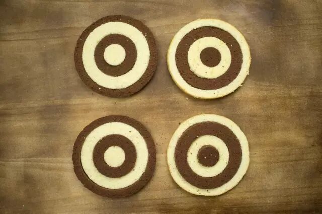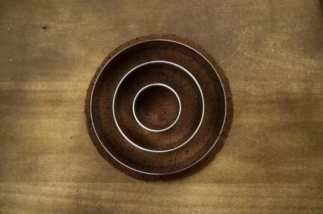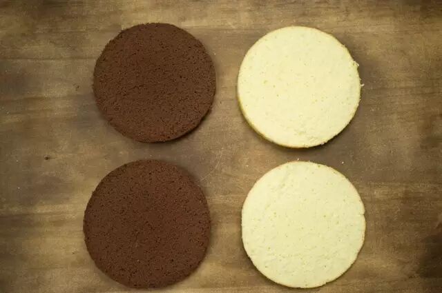 ②将烤好的蛋糕胚取出,每种都切分成均匀的两片。