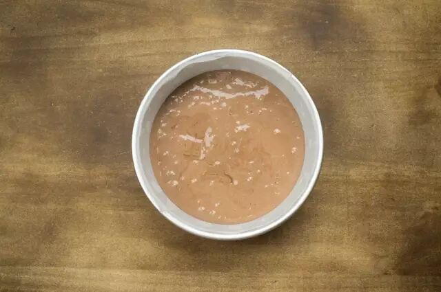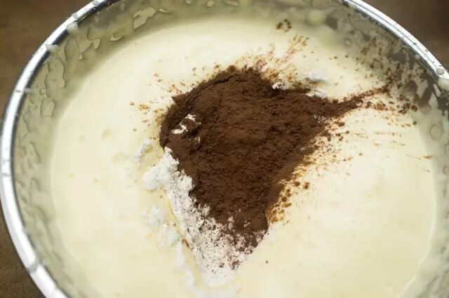 ①按照原味蛋糕胚的前三步,第四步的可可粉和低筋粉一起筛入,快速翻拌均匀,一定要注意翻拌手法,否则容易导致消泡,膨发高度不够。然后加入融化的黄油和牛奶,继续快速翻拌均匀。