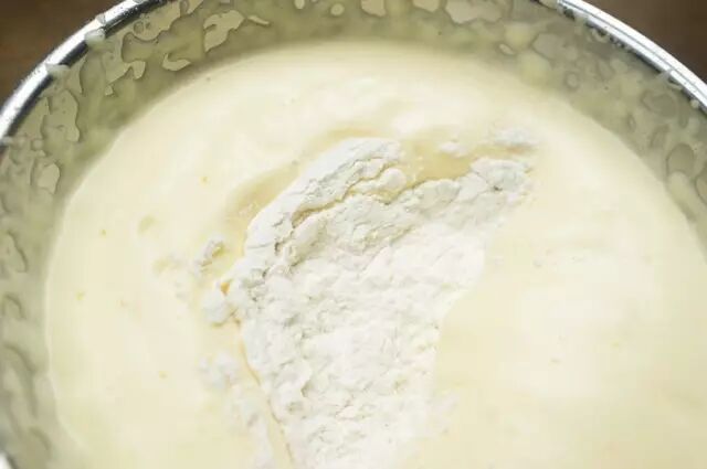 ⑤加入融化的黄油和牛奶,翻拌均匀。