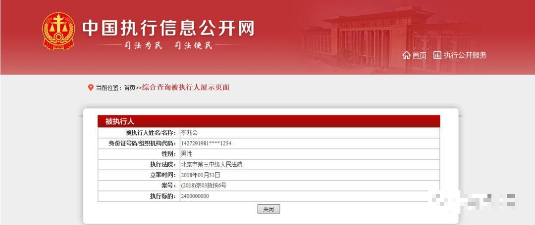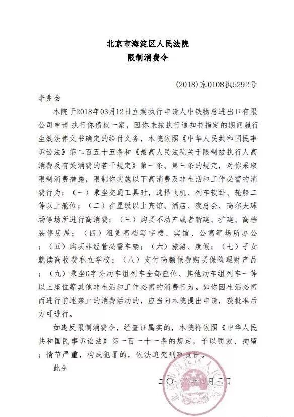 2017年,当年作为两人爱巢的比如世界商场附近的豪宅,也作价6753万元,划拨东亚银行,抵了李兆会的一部分债务。2018年,一份由北京市海淀区人民法院开具的执行单显示,李兆会已经成了“老赖”,他一共欠了2.18亿的钱,还剩未履行金额为5185658元。事实上,现在的李兆会名下已无可执行财产——他不仅没有一分钱,还被限制消费,被法院挂出大名来示众,可谓是颜面尽失,走到了山穷水尽的地步。