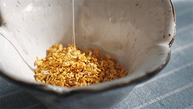 6、将适量蜂蜜和干桂花碎混合在一起,腌渍10分钟备用。