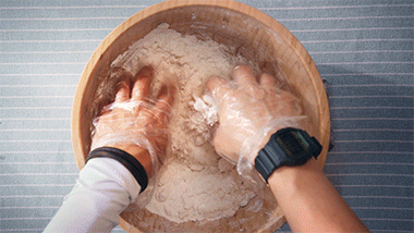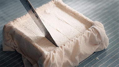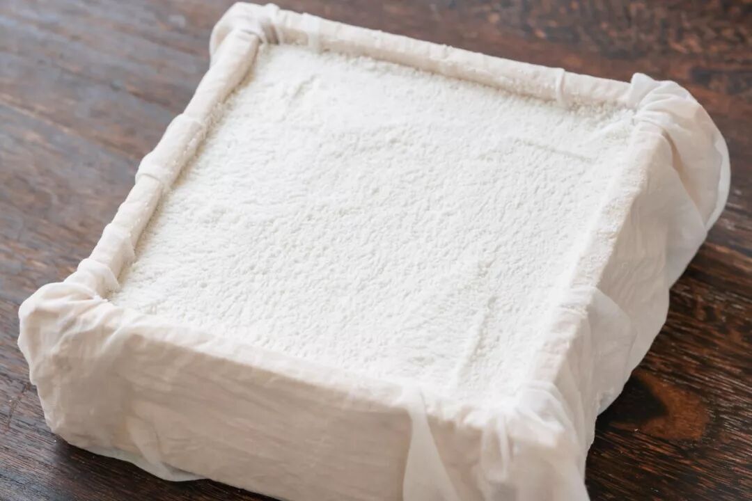 2、木制的容器里铺上湿的蒸笼布,将过筛好的粉料倒入模具内,轻轻振动模具,用抹刀抹平表面。