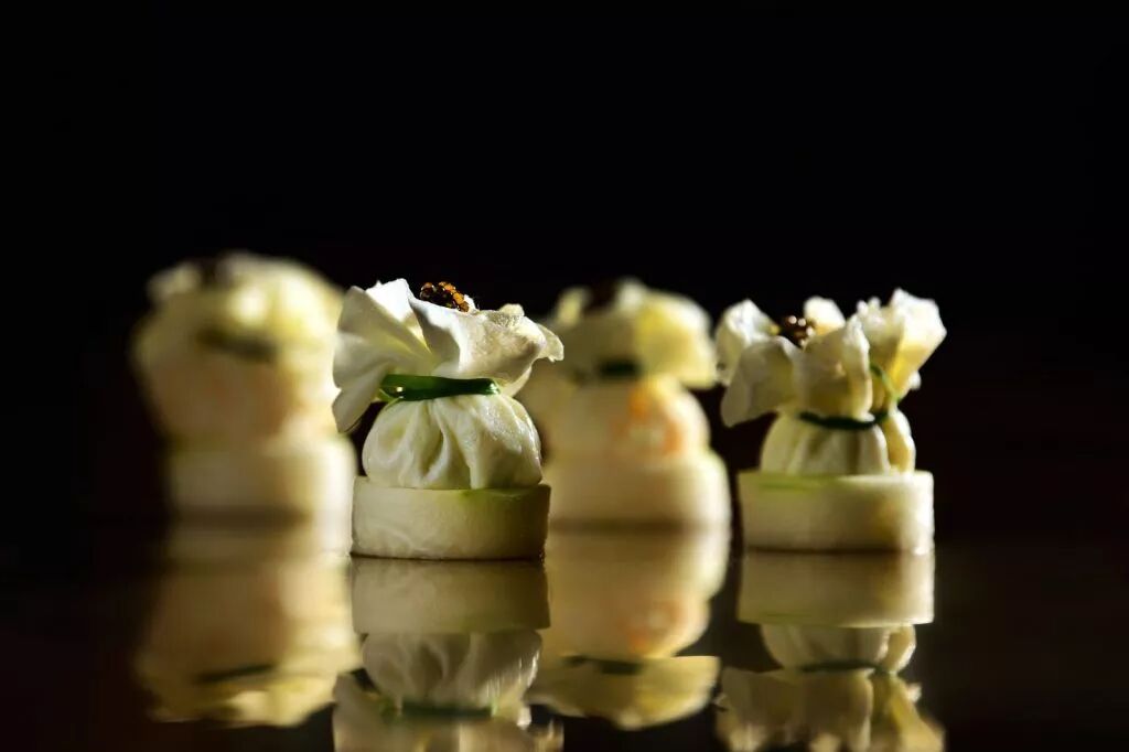 珍菌石榴包,鸡蛋皮包裹香菇粒、笋粒、肉粒等丰富馅料,别出心裁佐以晶莹剔透的鱼子酱,当爆破在口中的鱼子酱与传统馅料交融,带来山野与深海的双重极鲜诱惑。
