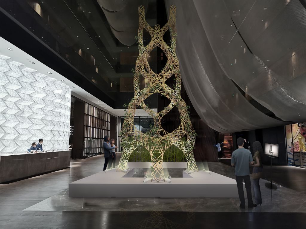 北京瑜舍作为“设计中国北京”的官方合作场地及合作伙伴,这一次他们为我们带来了非静止建筑设计的“编织丛林”。在“材料驱动设计”的理念下,无须迫使材料去做什么,而仅仅需要顺从或模拟材料表现的特性和状态。这件作品挑战了传统的设计和建造手法,呈现一种潜在的路径,一种“极少阻力”的路径。在这种意义上,老套的“人vs自然”的说法不再站得住脚。一种新的哲学由此产生——“自然中的人性”。一件作品并非仅由技术向前推进,而是在在多维度的参量交互下实现的演变。