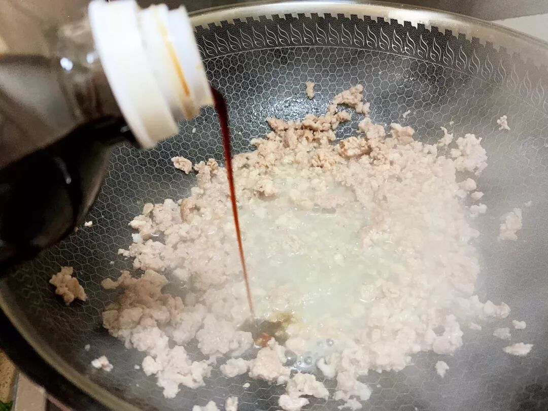 2. 热锅热油下肉末炒至变色,加入料酒和生抽炒均匀。