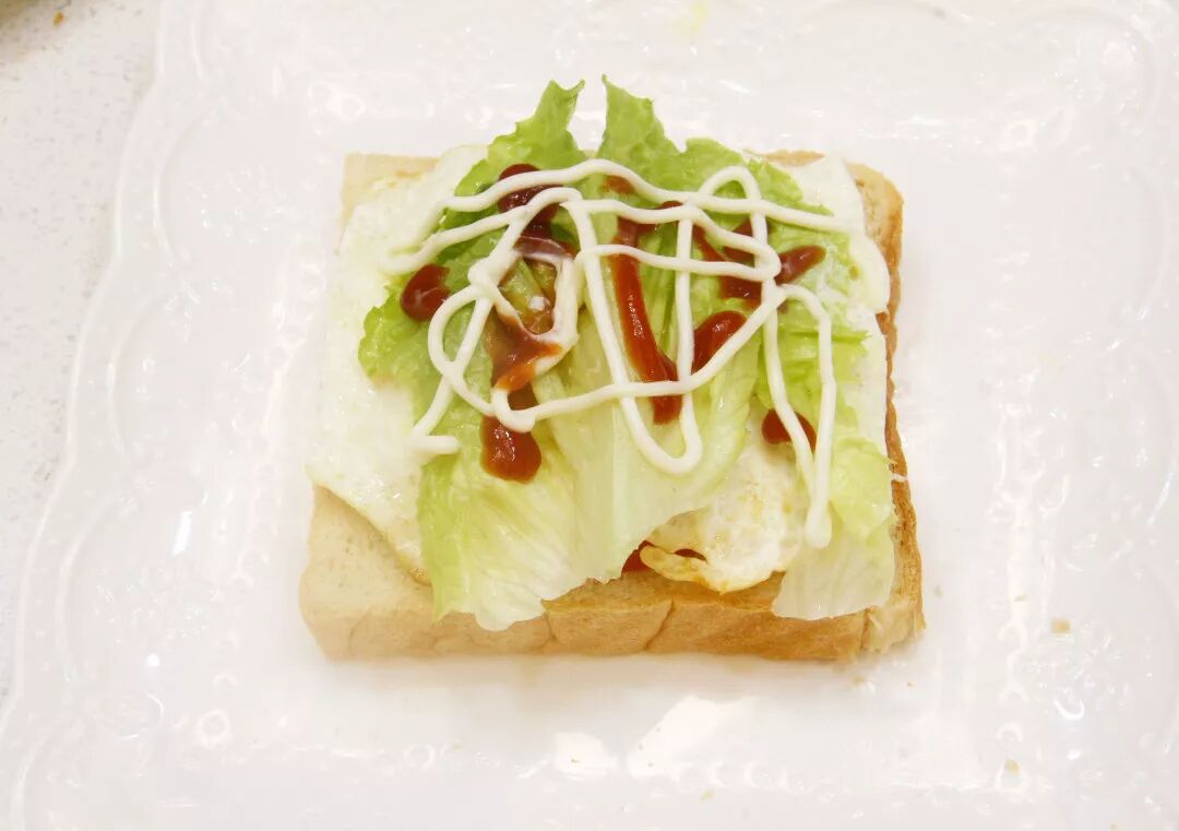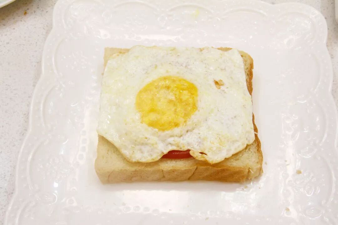 4. 取一块吐司片,上面放一片西红柿片,再加上煎好的鸡蛋。边缘可以修剪一下。