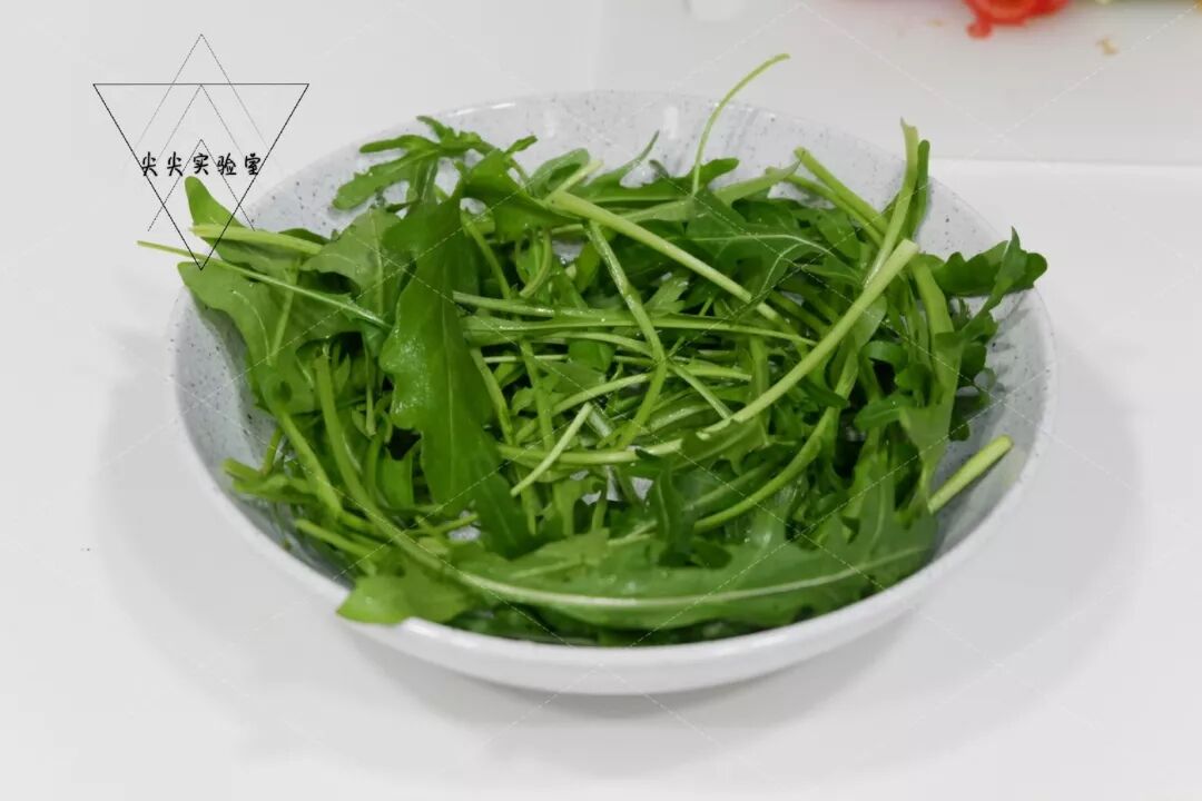 4. 洗净沥干水的芝麻菜铺碗底。