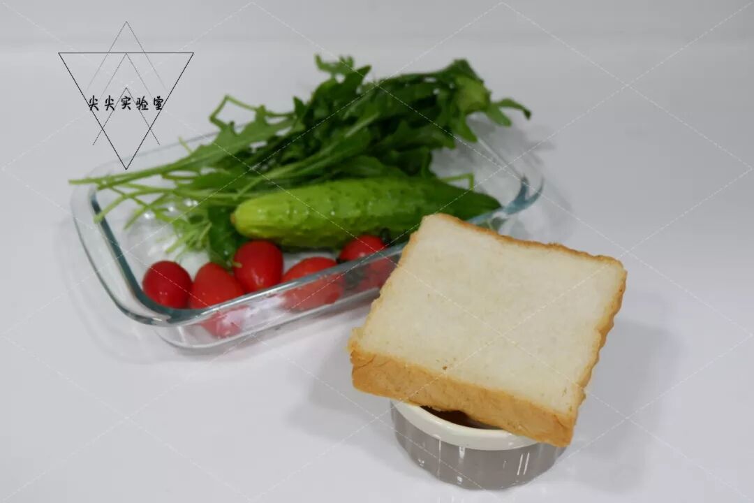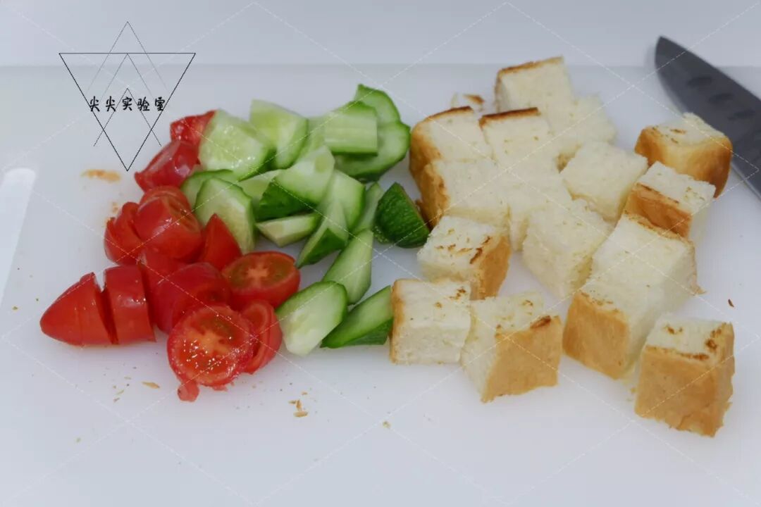 3.番茄、黄瓜、吐司都切成小丁。
