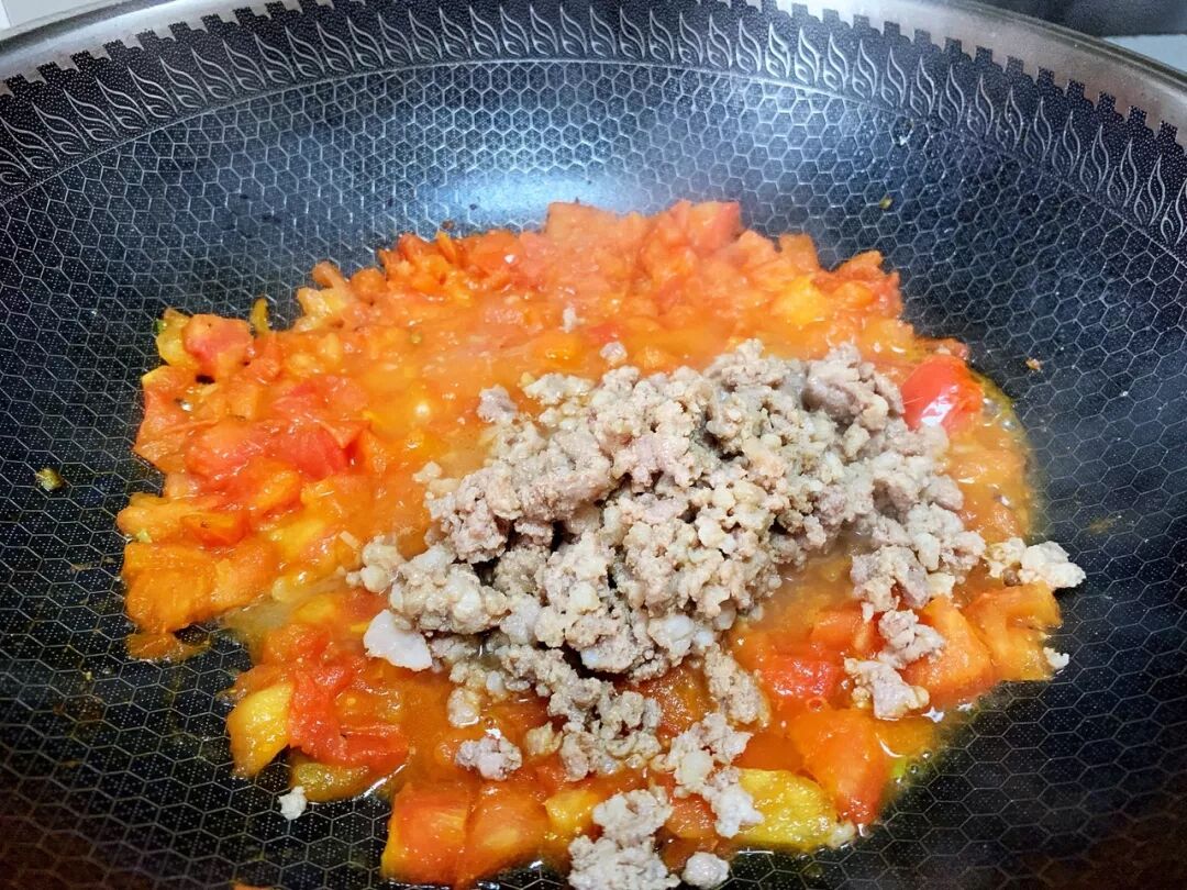 5. 加入炒好的肉末,翻炒均匀。
