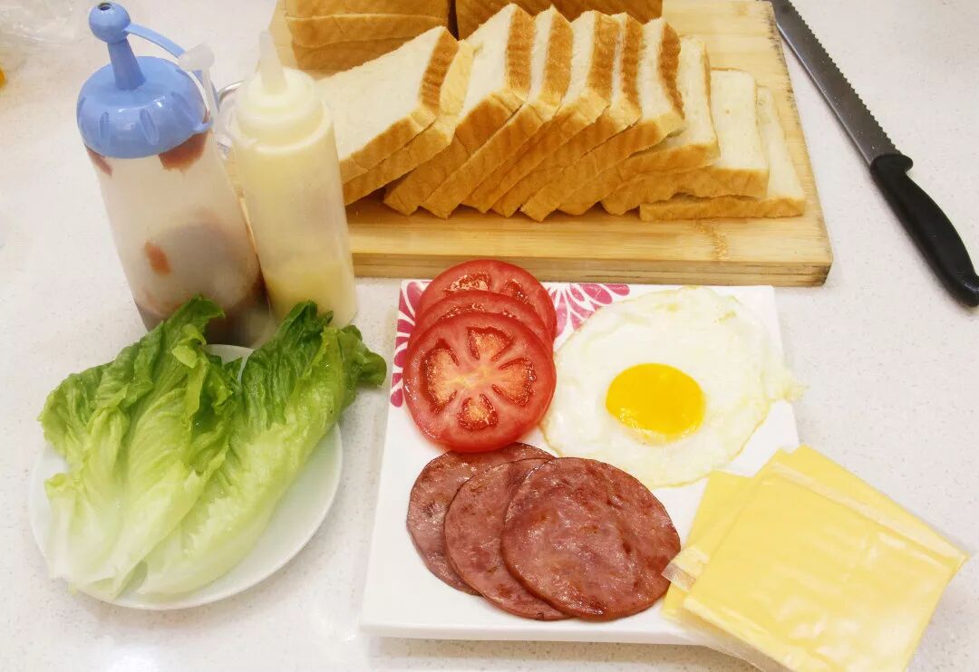 6. 加上芝士片,加上煎好的火腿片。加上另一片吐司片,用刀从中间切开一分为二即可。