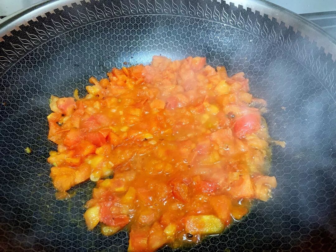 4.放入番茄炒至软烂,炒的时候多按压,以便出汁,