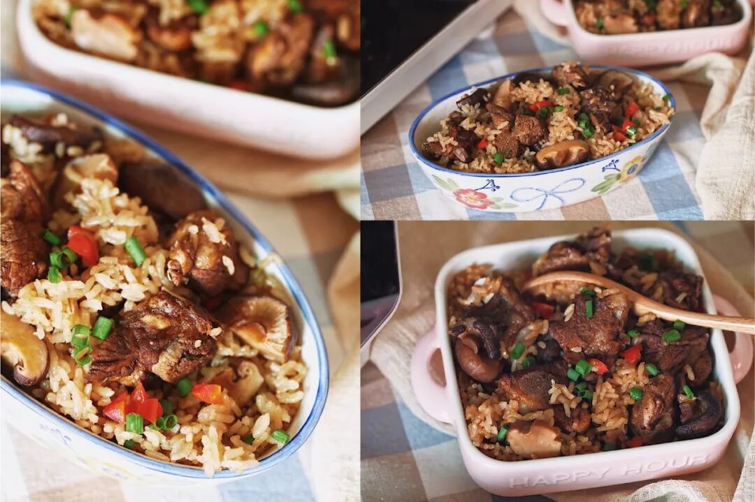 干香菇泡发、洗净、对半切开。排骨用生姜、料酒、盐抓匀腌制半小时。热油锅,下蒜末炒香后,放入排骨与香菇翻炒。加酱油、蚝油、糖调味。待上色均匀即可,无需炒熟。大米淘洗干净,放入耐高温容器,1:1加水。铺上炒过的排骨香菇,舀入两勺酱油汤汁。