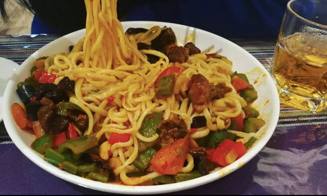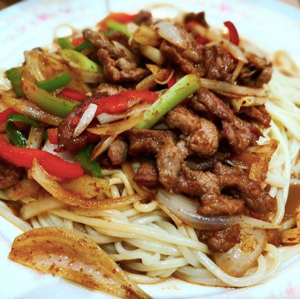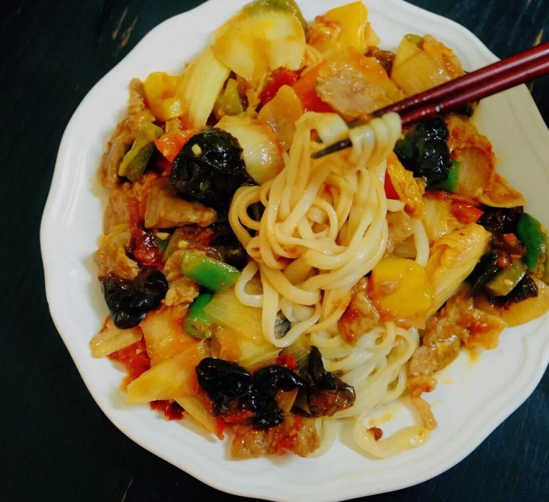 拉条煮到八成熟之后过下水,然后再搭配上洋葱、西红柿、青菜和牛肉大火快炒一下,出锅前来上一把孜然粉,还没上桌,香味早早就飘了过来,在口水留下来之前抢先吸入,沉浸在吸溜吸溜的畅快人生中...