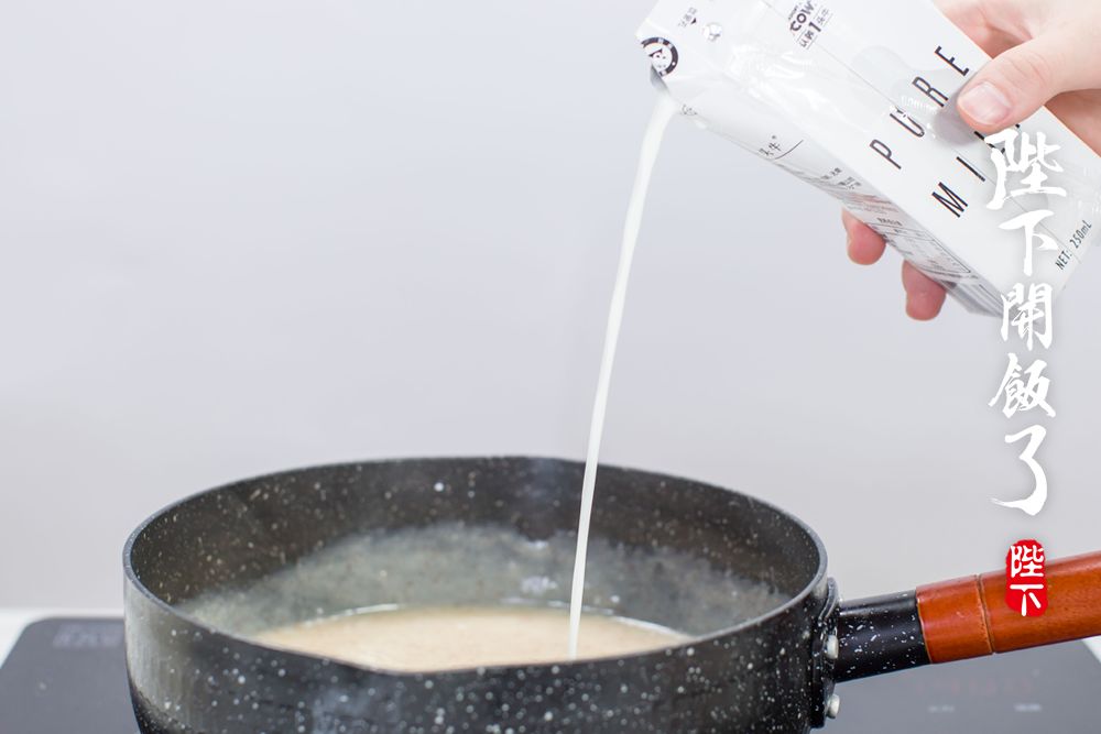 煮开后倒入牛奶,等再次煮开就可以关火了。中间也要时不时搅拌~