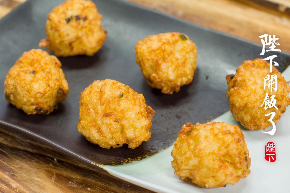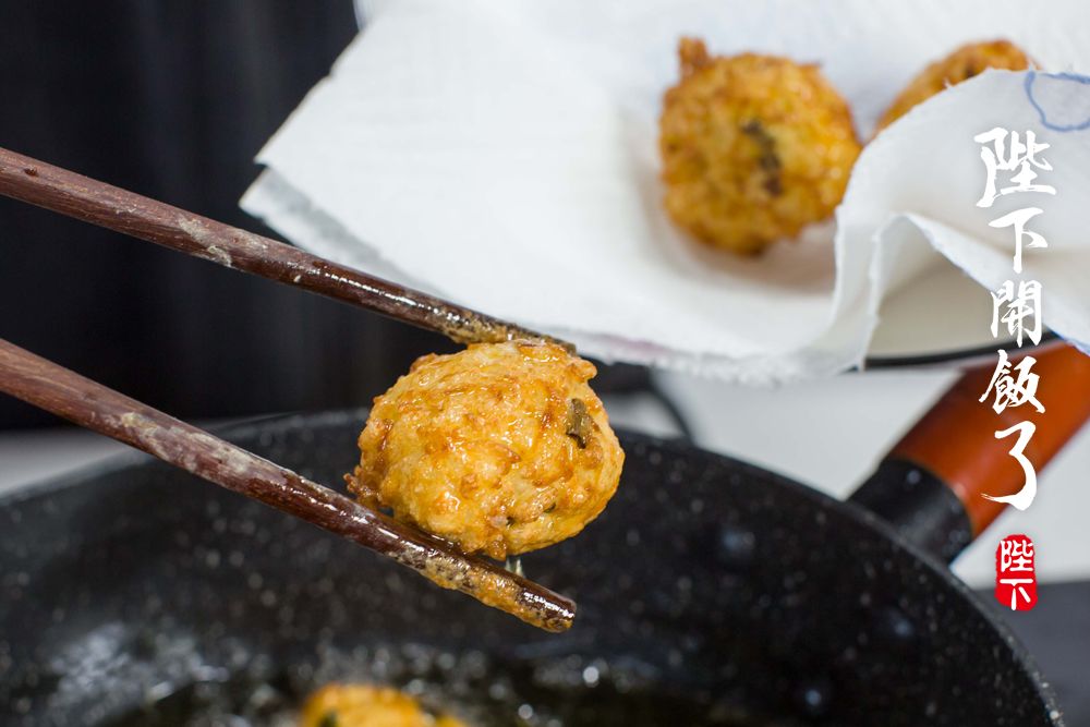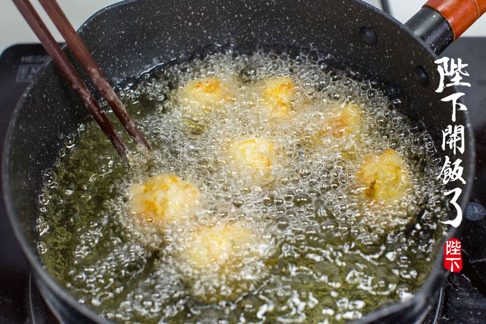 锅内热油,丢个葱花进去试探,油花乱冒时候就可以把丸子丢进去。炸至金黄就可以出锅啦~