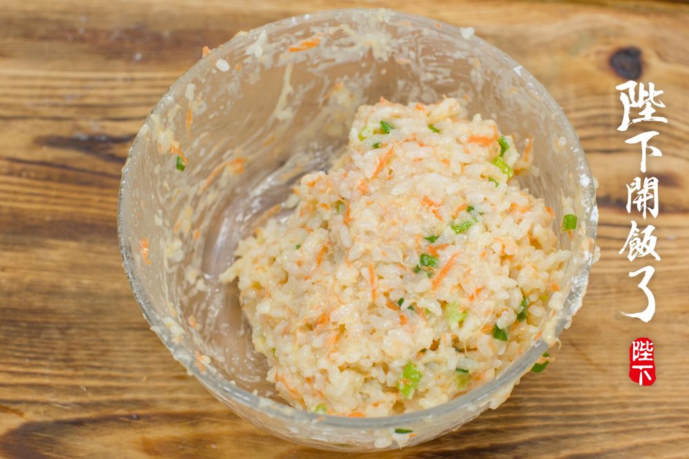 在第 2 步的加面粉环节,面粉的添加量是可以调整的哦,要是搅拌后米饭太稀,就多加些面粉,不会影响整体味道的啦,不要方~