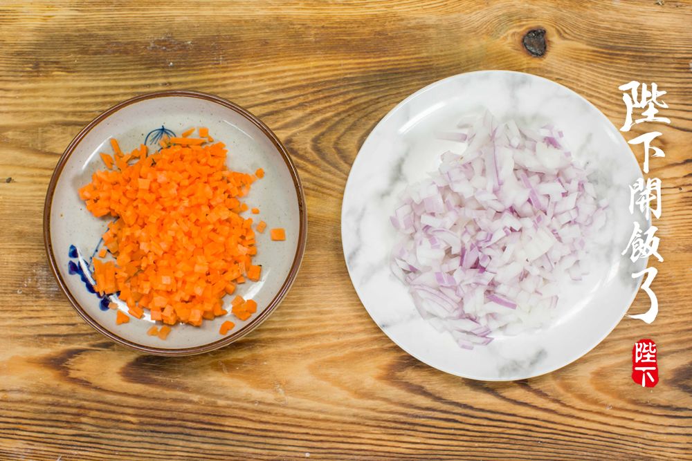 胡萝卜、洋葱切丁。注意哦,胡萝卜跟洋葱的丁要切小些,不然包在米饭里不好包,也不好看哈哈~