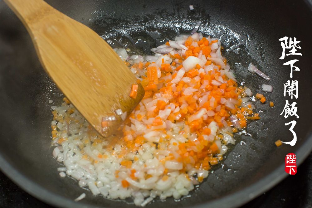 锅内热油,胡萝卜、洋葱下锅翻炒一会盛出来。米饭加热,微波叮一分钟后拿出来。