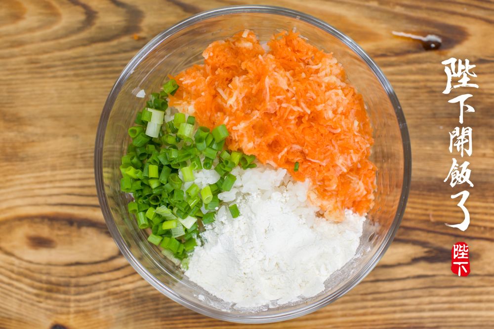 萝卜、土豆擦丝,加一勺盐腌制 15 分钟,让水分沥出。(除了腌制过程要加些盐,其余不用再加盐了哦,味道已经够了。)