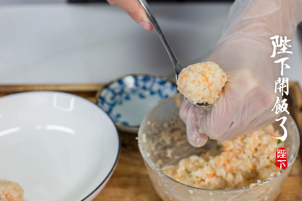 右手抓起米饭,食指和大拇指圈成个小圈圈,然后开始挤丸子。这里可以准备个金属勺子,把挤出来的丸子刮下来。(这步你们也可以直接搓丸子,就像搓汤圆那样~)
