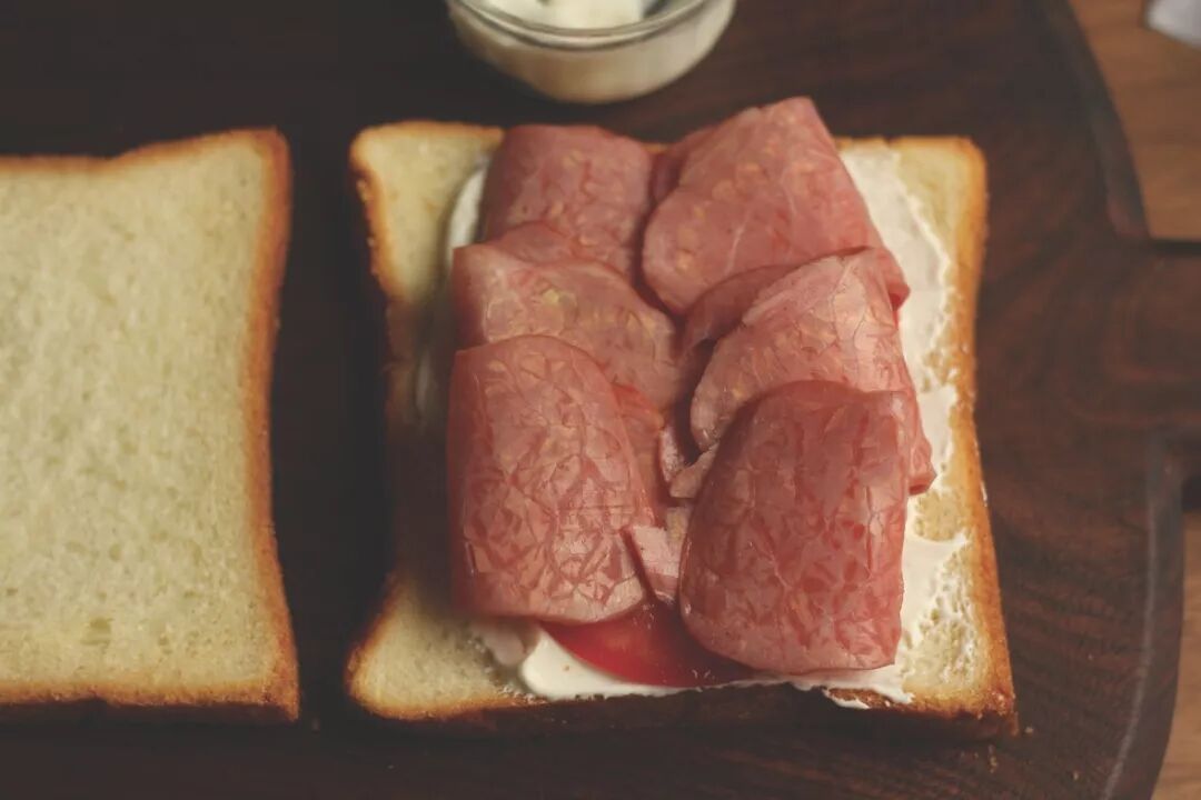②按照同样的顺序,再放上一片吐司、蛋黄酱、生菜叶和火腿片,最后盖上一片吐司。