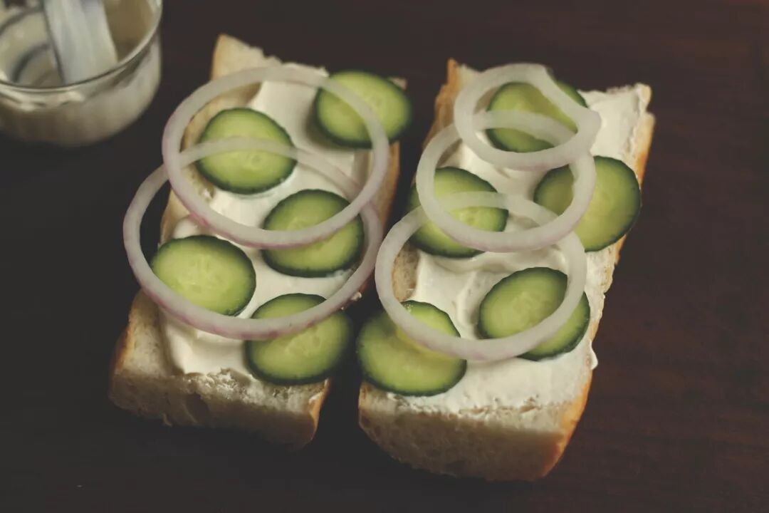 ③盖上另一片吐司,上面用黄瓜条装饰。