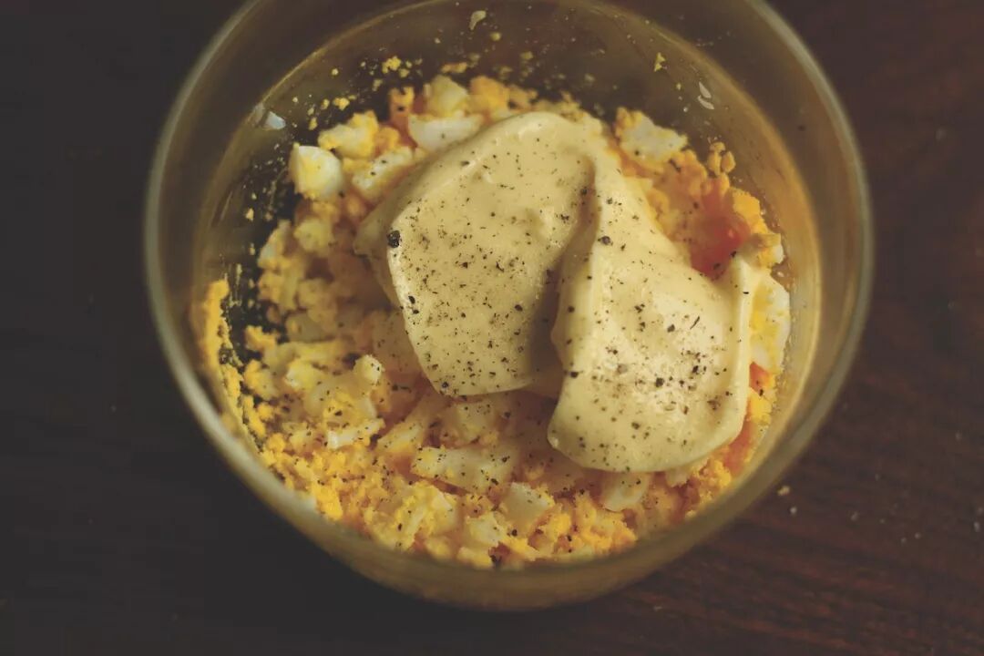 ②制作鸡蛋沙拉迷你三明治:鸡蛋煮熟后用叉子搅碎,放入蛋黄酱和适量盐、胡椒粉,做成鸡蛋沙拉。将鸡蛋沙拉夹在吐司中间,并将吐司均匀切成小正方形。