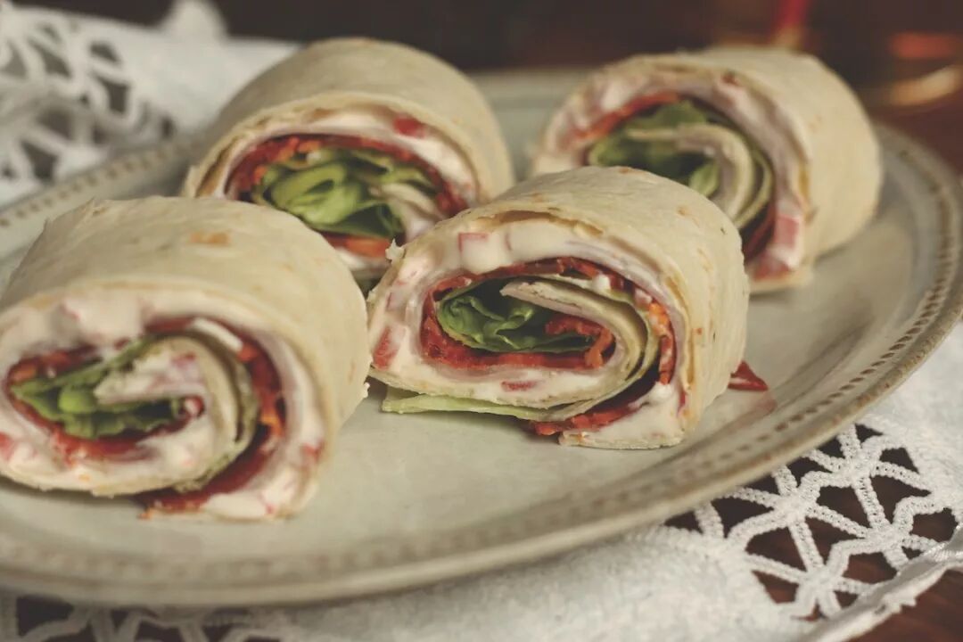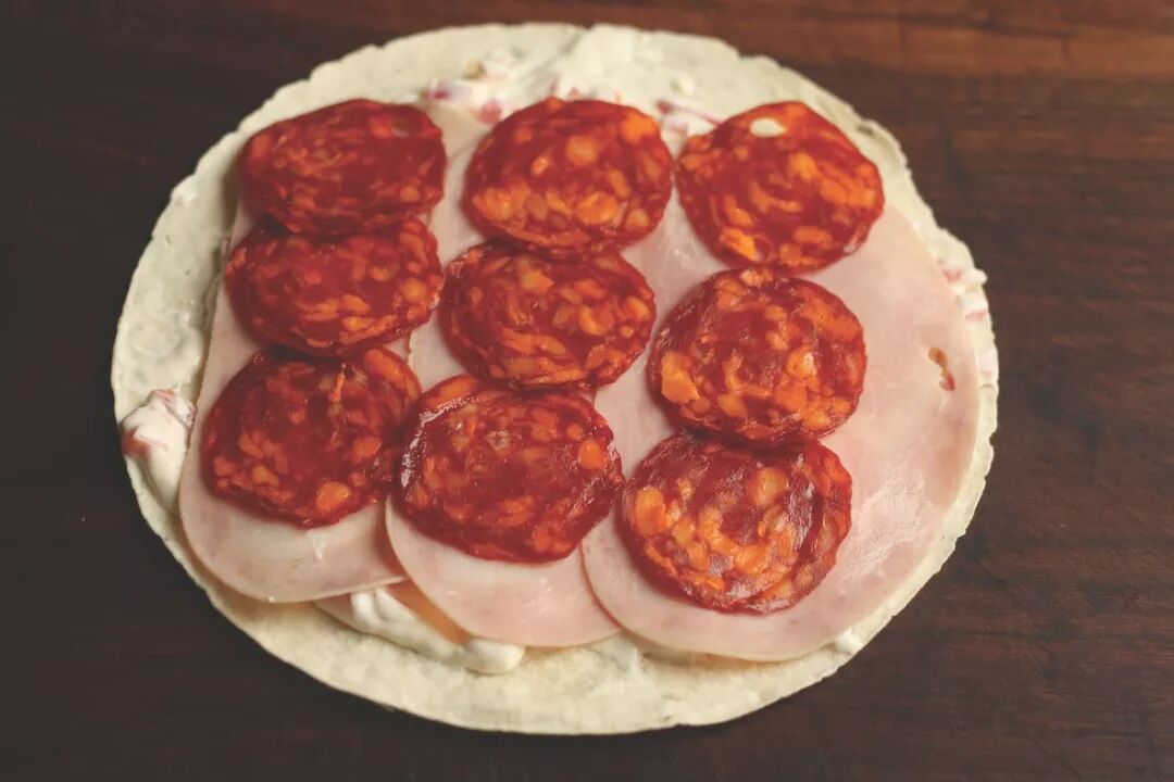 ②依次放上萨拉米肠、火腿片和生菜叶,然后卷起卷饼。