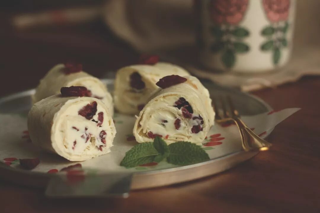 ②将蔓越莓干撒在奶油奶酪上,然后卷起卷饼。