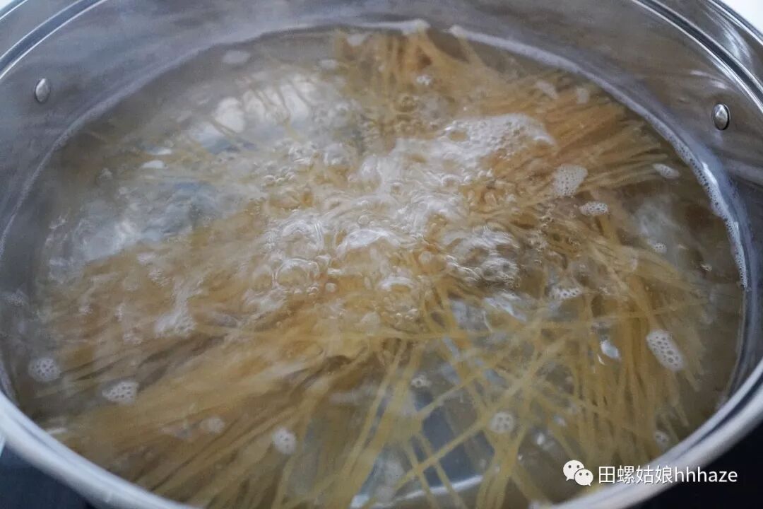 祭出家里最大的汤锅,烧一锅水,水里放一勺盐。然后计时把意面煮到比说明上少两分钟(大部分意面包装上都会有时间说明)。
