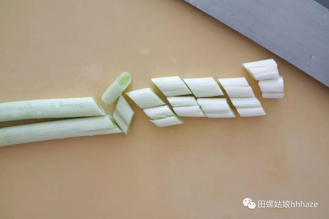 再次谴责一下又㕛叒叕没洗干净蒜白和蒜绿连接处缝隙里泥沙的家属,然后自己返工再洗洗。用菜刀把青蒜的蒜白部分稍拍一下,以免这个季节的青蒜偏老而导致蒜白太硬,再把整根青蒜切成指甲盖长短的段。