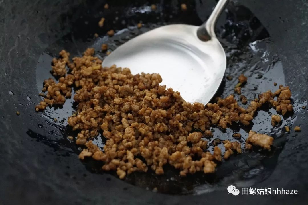 此时先倒入炒好的万能肉末,无论如何要让肉末再次炒热,炒热才酥。